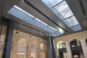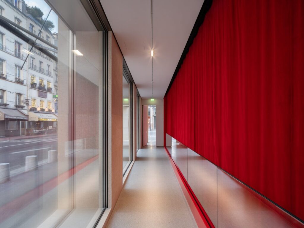Nos équipes ont également assuré la fabrication et la pose des menuiseries acier coupe-feu et acoustiques, notamment dans la salle de l’auditorium, reconnaissable à sa teinte rouge emblématique.