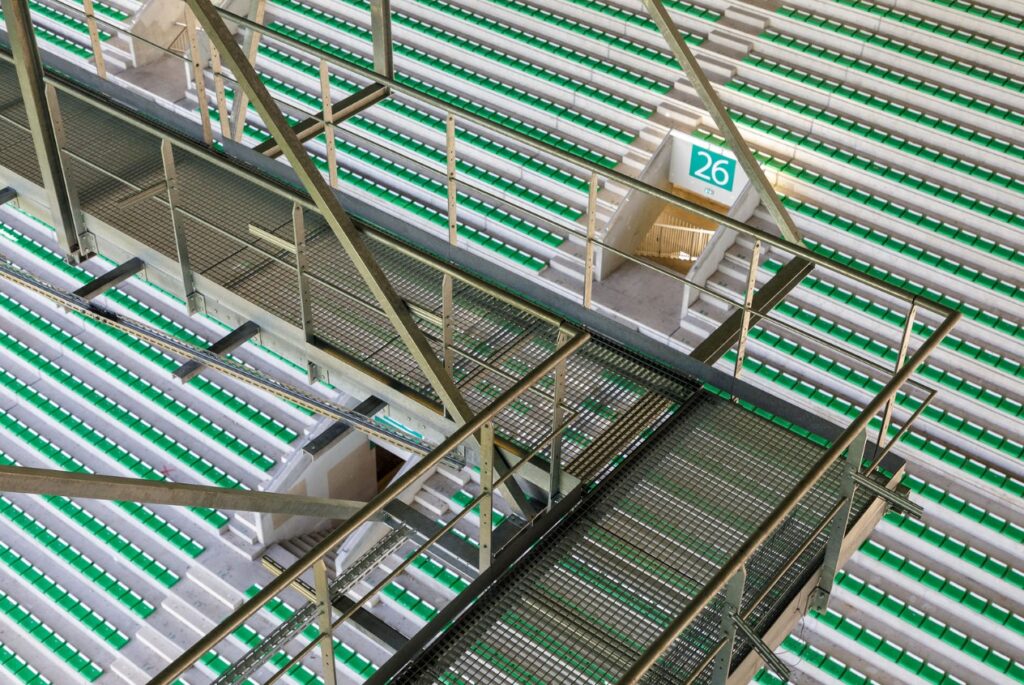 Parmi les interventions majeures, la réalisation et l’installation de nouvelles passerelles techniques viennent moderniser et renforcer les équipements du stade, tout en respectant son identité forte et son architecture emblématique.